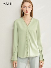 Amii ミニマリスト秋シャツ女性 V ネック品質シャツレースパッチワーク長袖トップオフィスレディシフォンシャツ 12230274 ロング オータム 秋物 Vネック 会社 学校 通勤や通学にも | twelve