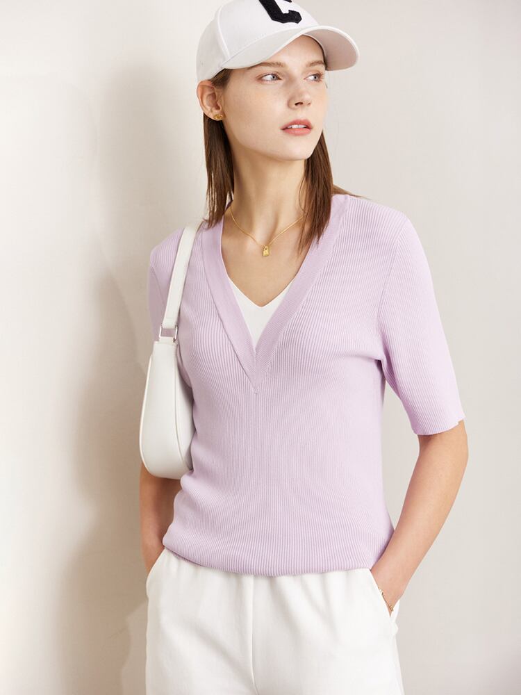 AMII ミニマリスト Tシャツ女性春スプライシング V ネックオフィスレディ Tシャツプルオーバートップス 12230079 スプリング 春物 Vネック 会社 学校 通勤や通学にも | twelve