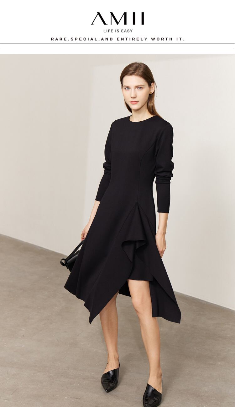 AMII ミニマリストドレス女性春非対称フレンチスタイル 0 ネック A ラインソリッドスリムミッドカーフ Vestidos 72341036 スプリング 春物 Aライン ソリッドカラー | twelve