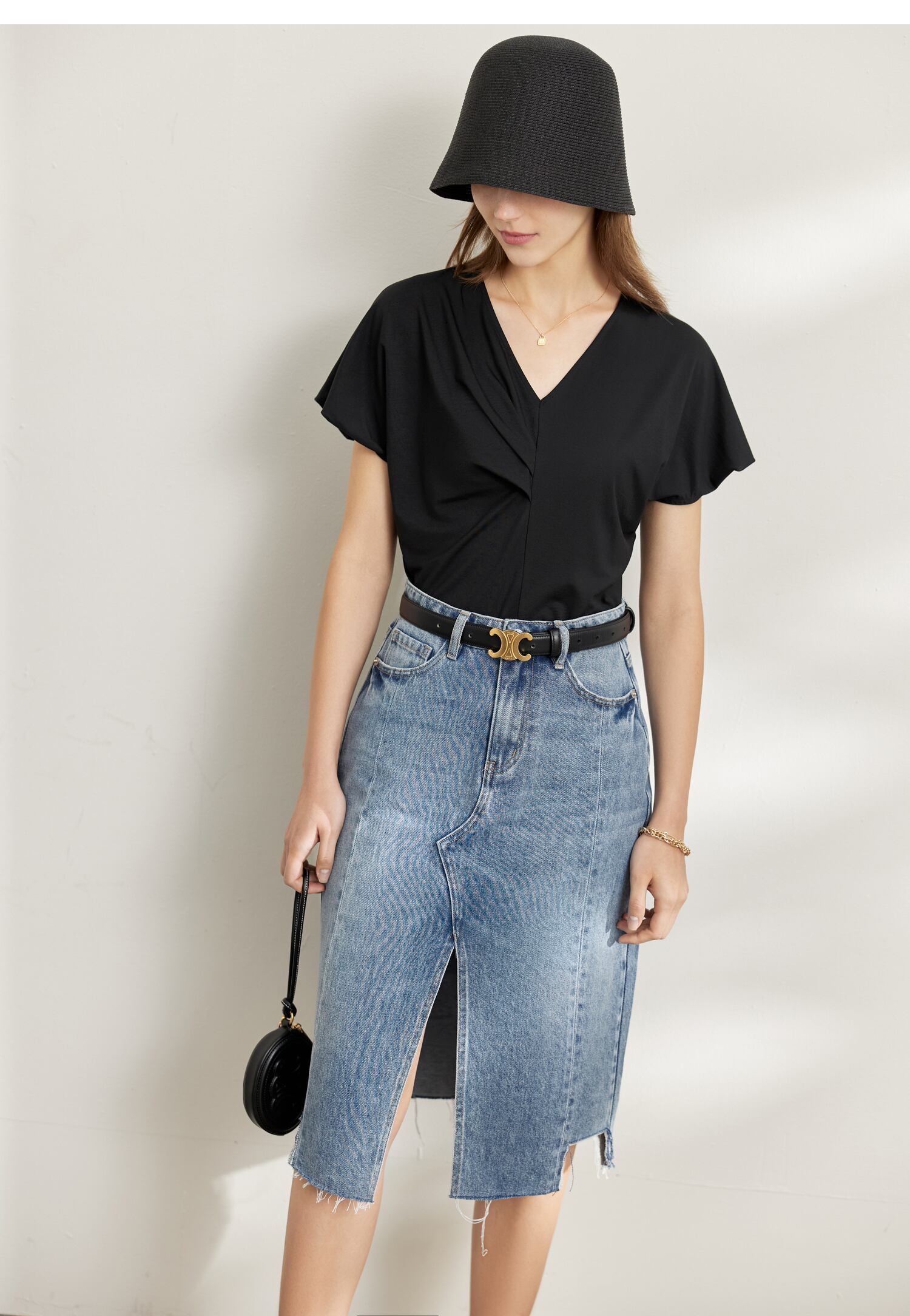 Amii ミニマリズム デニム スカート夏非対称スリット オフィス レディ デニム スカート A ライン ミディ スカート 12240486 サマー 夏物 Aライン 会社 学校 通勤や通学にも | twelve