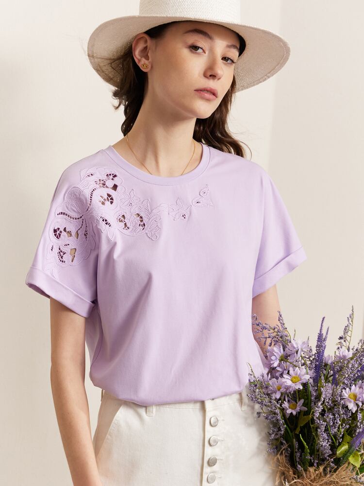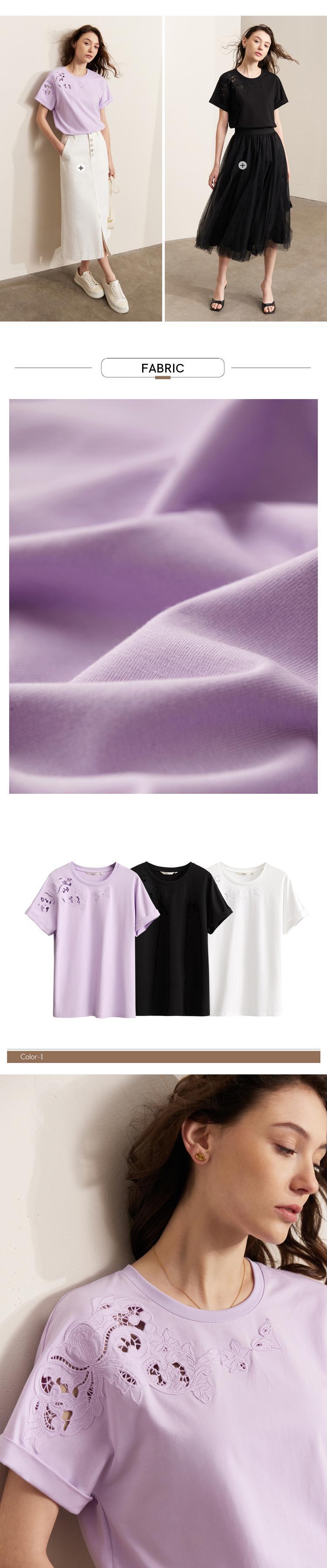 AMII ミニマリズム Tシャツ春 Audal 綿半袖 O ネック Tシャツ中空刺繍トップスブラウス 12332009 ショート コットン ハーフスリーブ スプリング 春物 Oネック | twelve