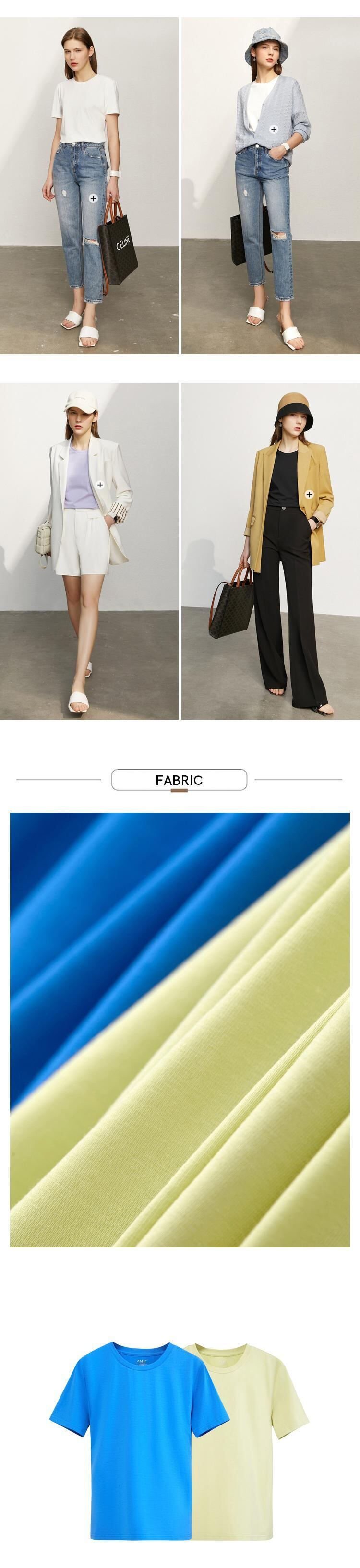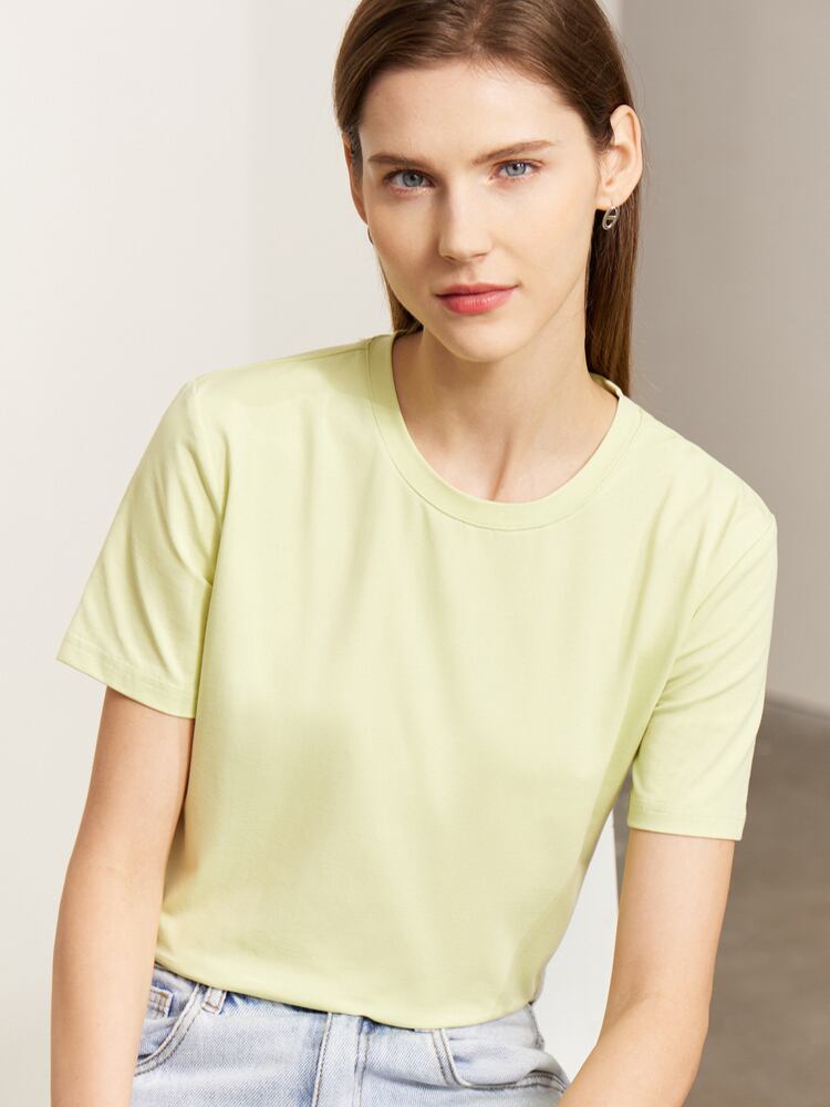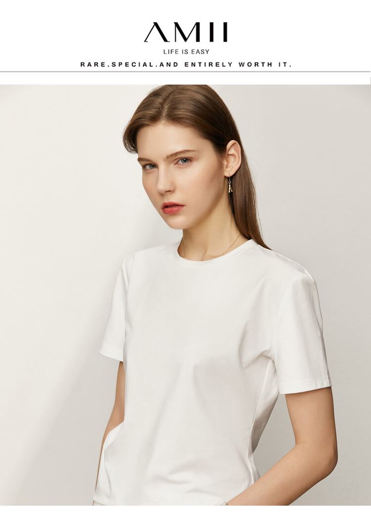 Amii ミニマリスト Tシャツシック春ラウンド ネック万能スリムフィット弾性半袖トップス 12342270 ショート ハーフスリーブ エラスティック 伸縮 スプリング 春物 Oネック ソリッドカラー | twelve