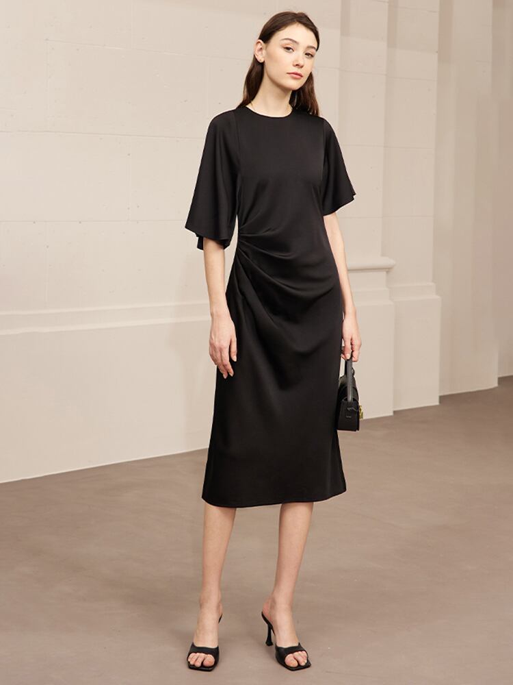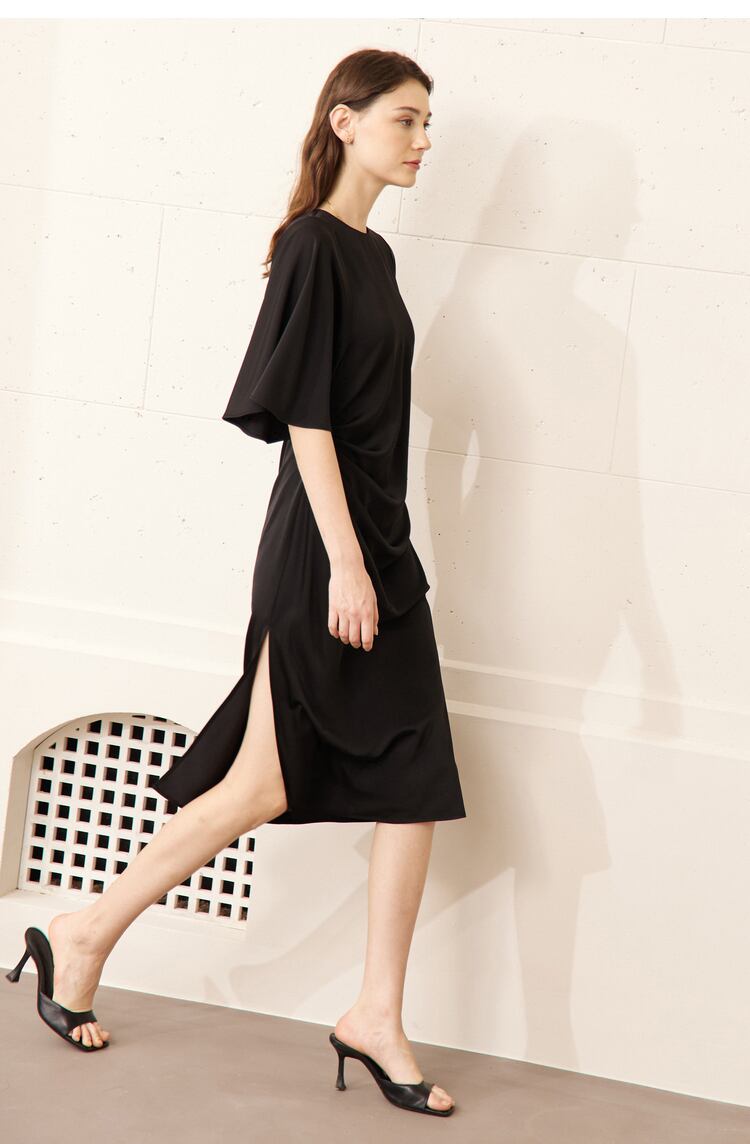AMII ミニマリズム 夏 シャーリング Vestidos バットウィングスリーブ プルオーバー Aライン ブラック シック オフィスレディ レディース ドレス 12332006 サマー 夏物 会社 学校 通勤や通学にも | twelve