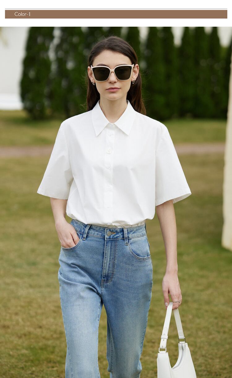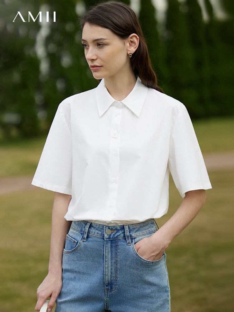 AMII ミニマリズム 半袖 シャツ&ブラウス ボタン 夏 ルーズ ホワイト 綿100% レディース シャツ トップス 12342206 ショート コットン ハーフスリーブ サマー 夏物