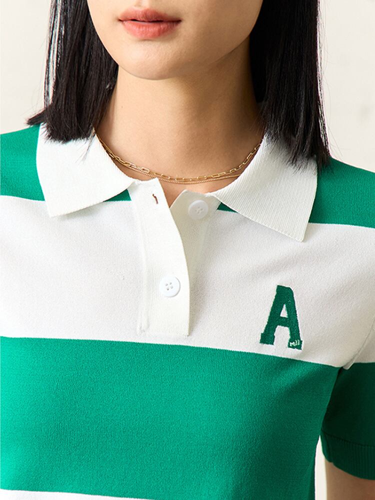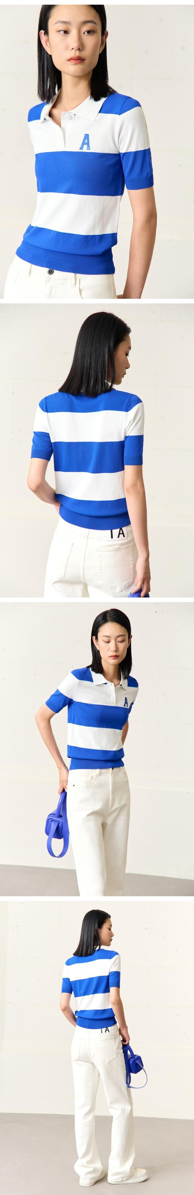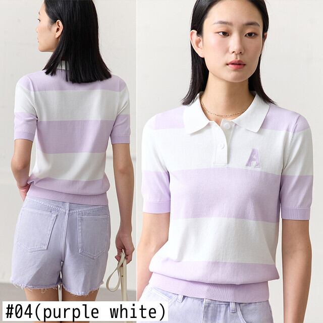 AMII ミニマリズム ポロネック カーディガン レディース コントラスト ワイドストライプ 半袖 ターンダウンカラー ニット プルオーバー 12322087 ショート ハーフスリーブ | twelve