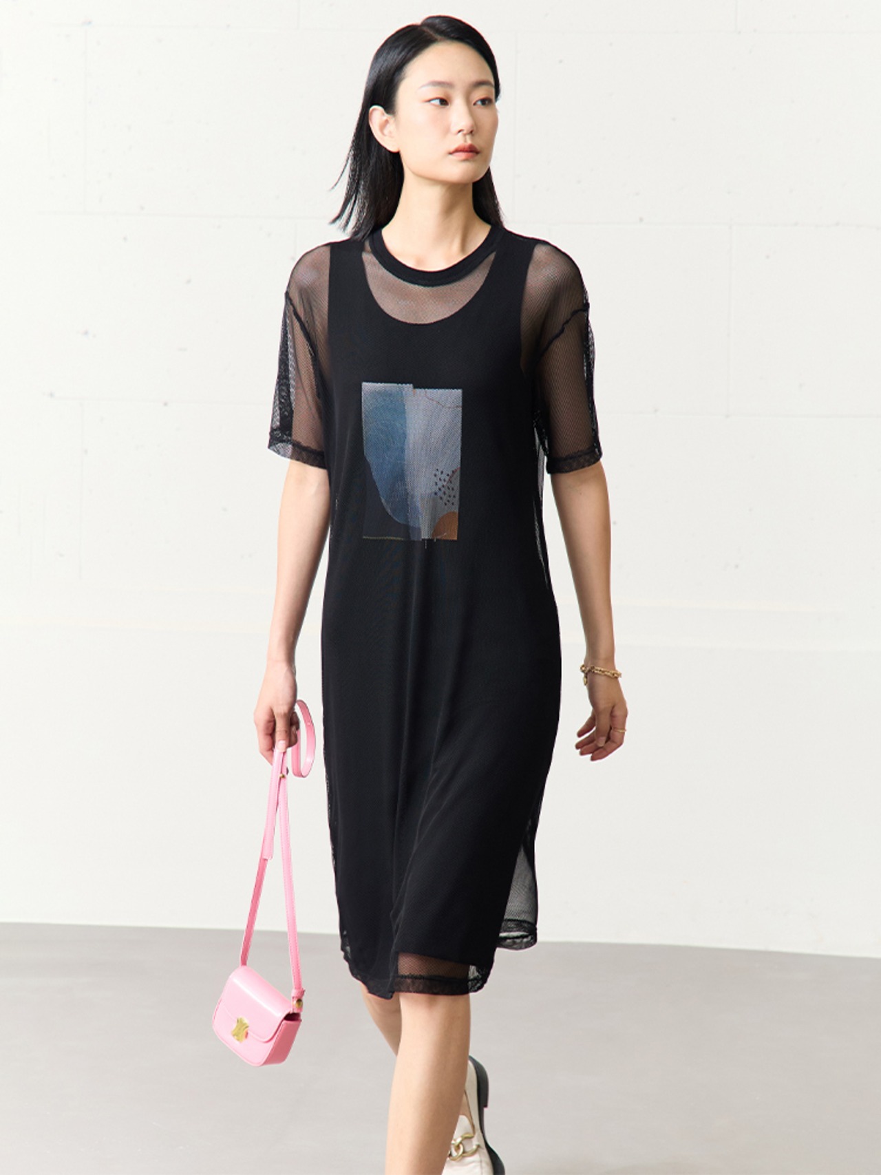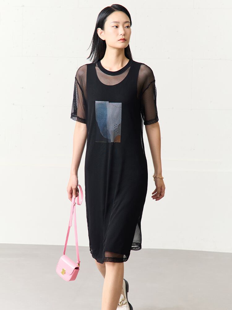 AMII ミニマリズム夏メッシュプリント白ドレス半袖オフィスレディロングタンク Vestidos 薄手 12342373 ショート ホワイト ハーフスリーブ サマー 夏物 会社 学校 通勤や通学にも | twelve