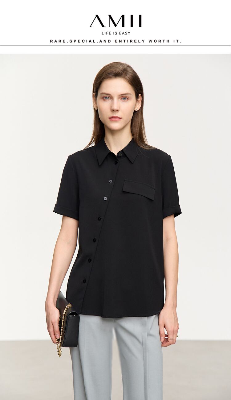 AMII ミニマリズム オフィス レディー シャツ & ブラウス 夏 半袖 シフォン ルーズ レディース シャツ ブラック トップ 12342606 ショート ハーフスリーブ サマー 夏物 会社 学校 通勤や通学にも | twelve