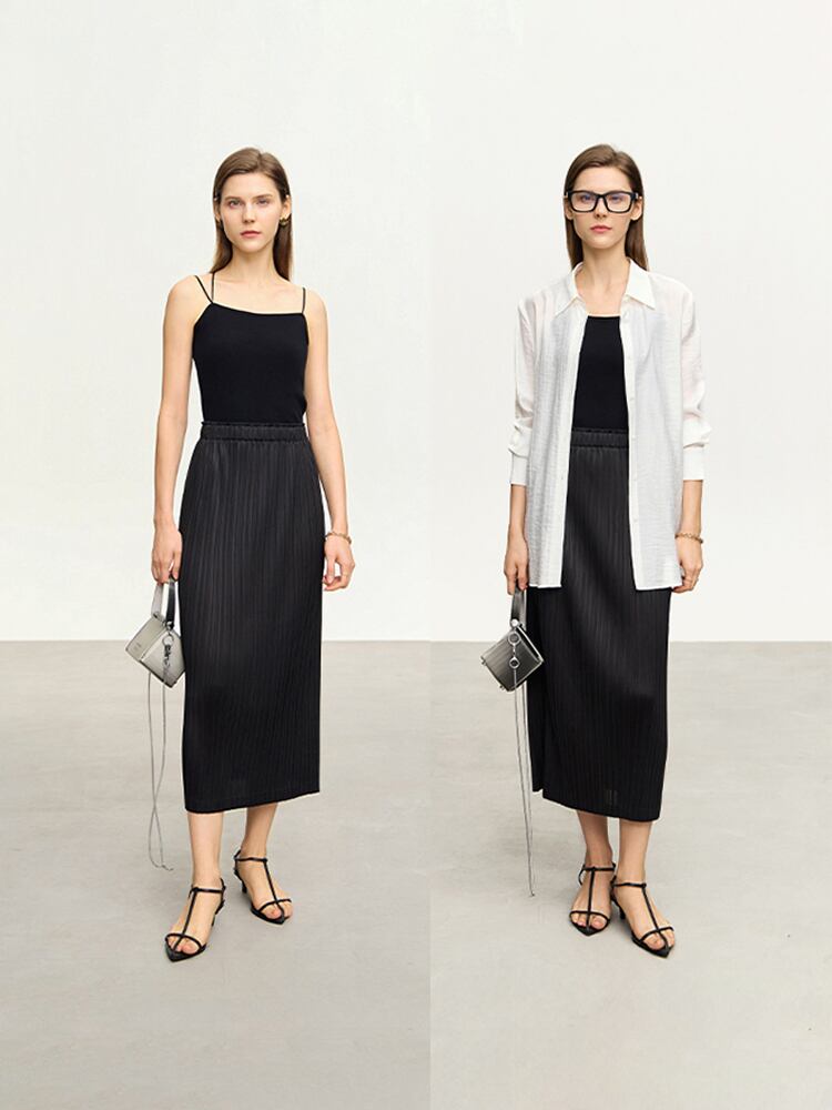 AMII ミニマリズム レディース スカート オフィス レディー 夏 無地 ウエストゴム ストレート プリーツ スカート ロング 12342617 エラスティック 伸縮 サマー 夏物 ソリッドカラー 会社 学校 通勤や通学にも | twelve