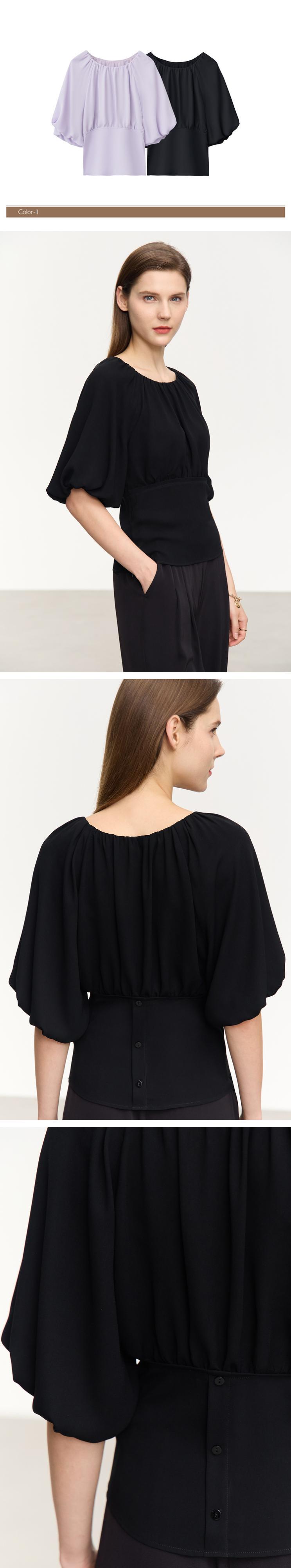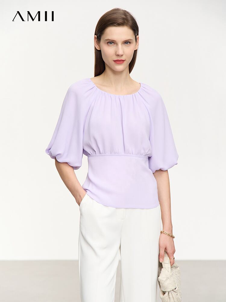 AMII ミニマリズム夏シャツ & ブラウスオフィスレディ O ネックパフスリーブウエストシフォンシックブラウス 12342383 サマー 夏物 Oネック 会社 学校 通勤や通学にも | twelve