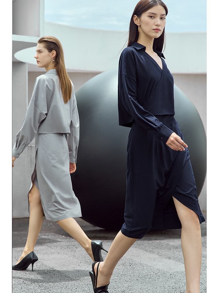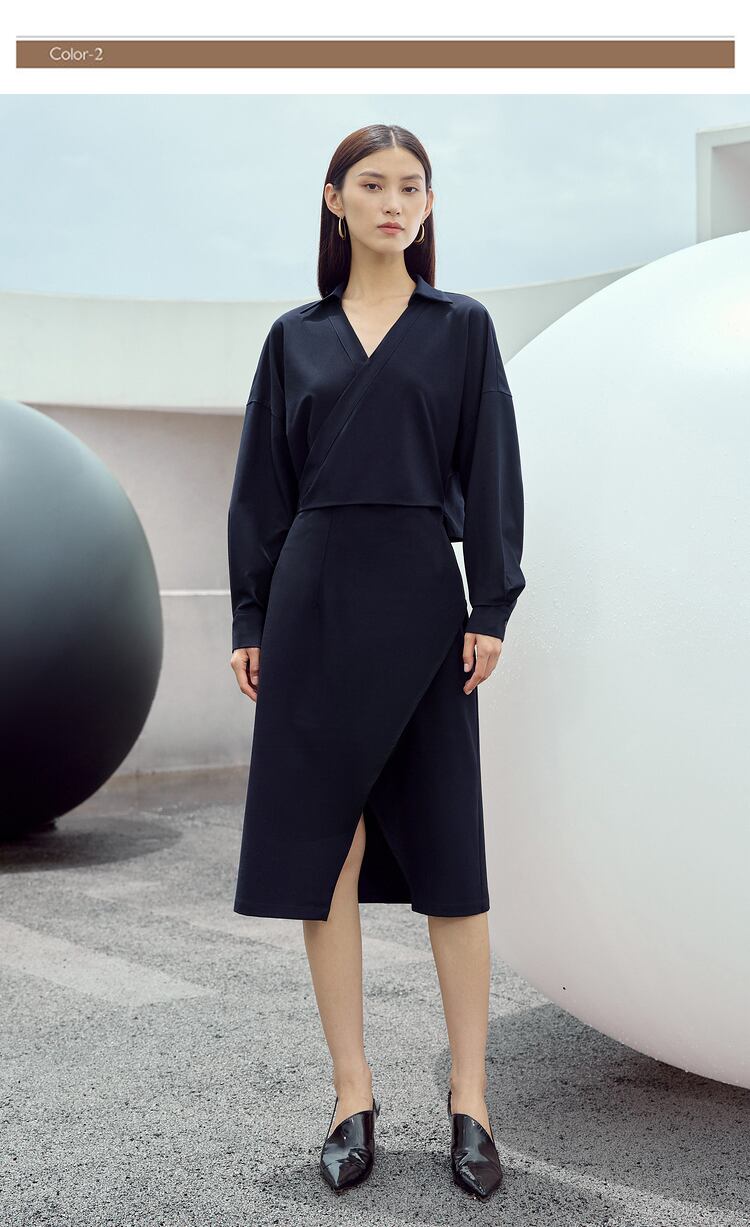 AMII ミニマリストオーバーラップドレス秋シンプルオフィスレディ V ネック長袖ソリッドドレス 12343099 ロング オータム 秋物 Vネック ソリッドカラー 会社 学校 通勤や通学にも | twelve
