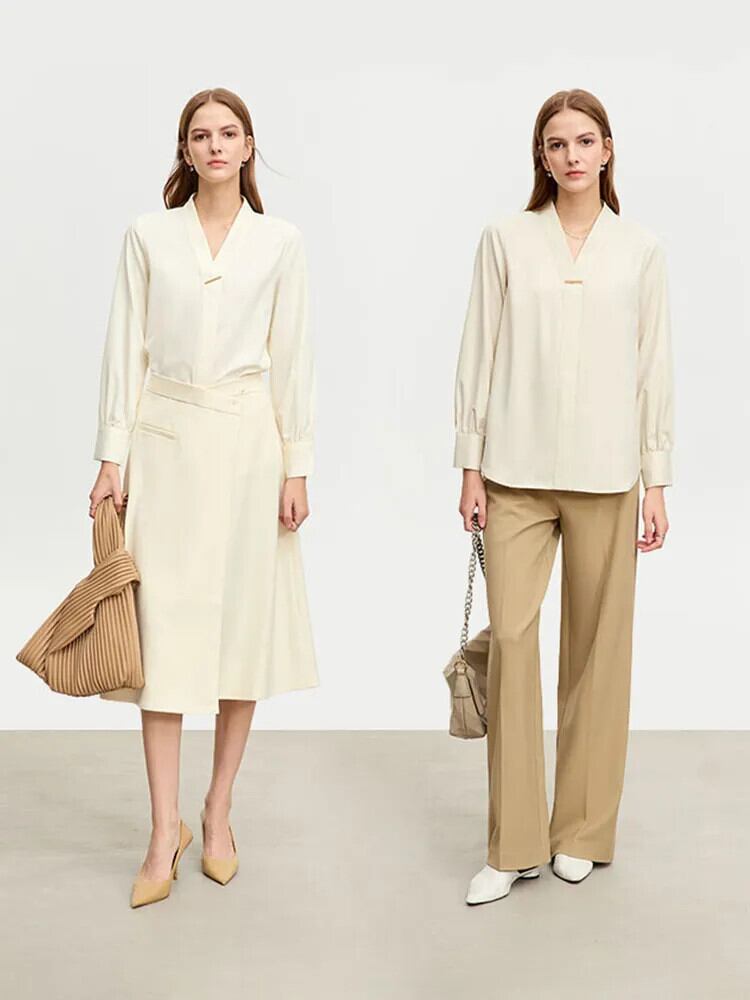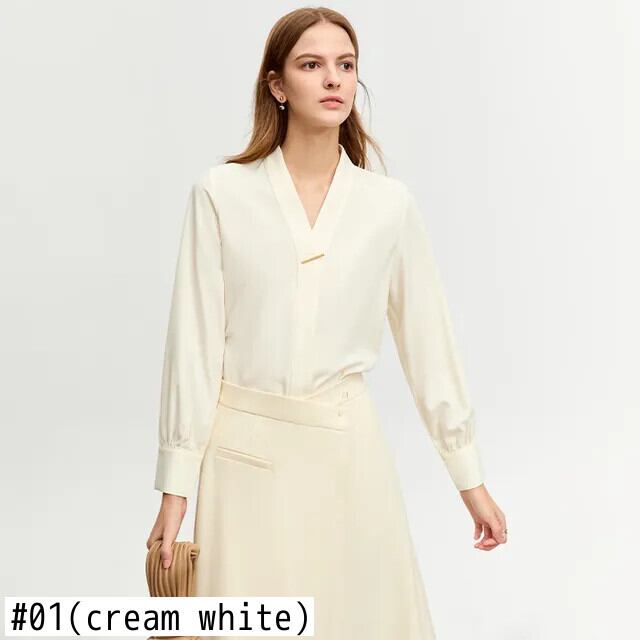 AMII ミニマリスト中国シャツ冬ルーズオフィスレディ V ネック長袖シャツ & ブラウス 12343272 ロング ウィンター 冬物 Vネック ソリッドカラー 会社 学校 通勤や通学にも