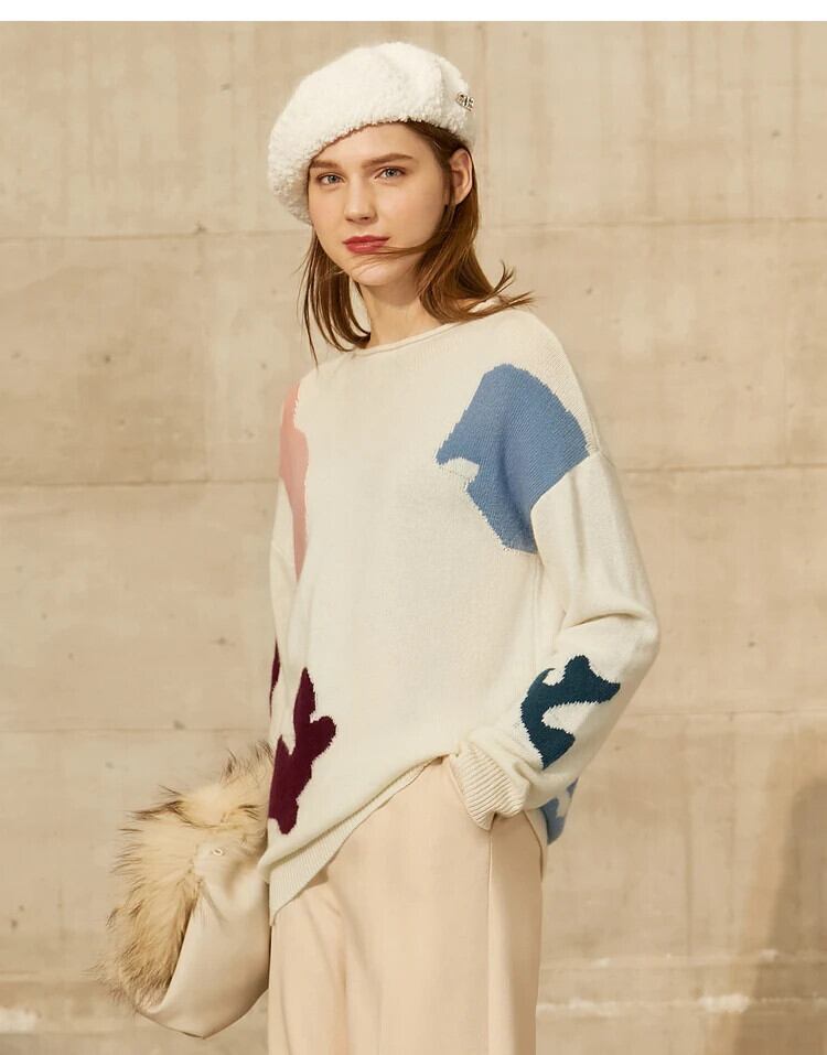 AMII かわいいグラフィックウールセーター冬ルーズニットクルーネック長袖コントラストカラープルオーバー暖かいトップス 12343422 ロング 大人ガーリー スウィート キュート カジュアル ウィンター 冬物 | twelve