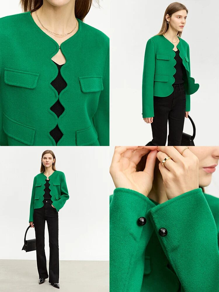 AMII 両面ウールショートコート冬オフィスレディクロップジャケットラウンドネックウールウェーブオープンステッチトップス 12344118 ウィンター 冬物 Oネック 会社 学校 通勤や通学にも | twelve