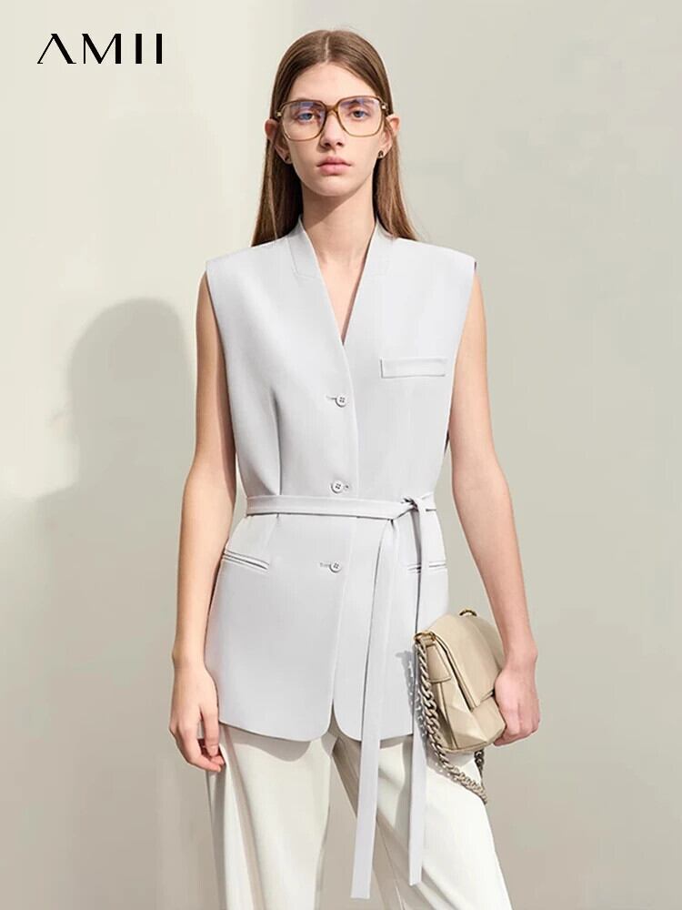 AMII ミニマリズム 2024 春ベストストリートソリッドベルト付きノースリーブミッドレングススリム V ネックジャケット 12441145 スプリング 春物 ハーネス Vネック ソリッドカラー | twelve