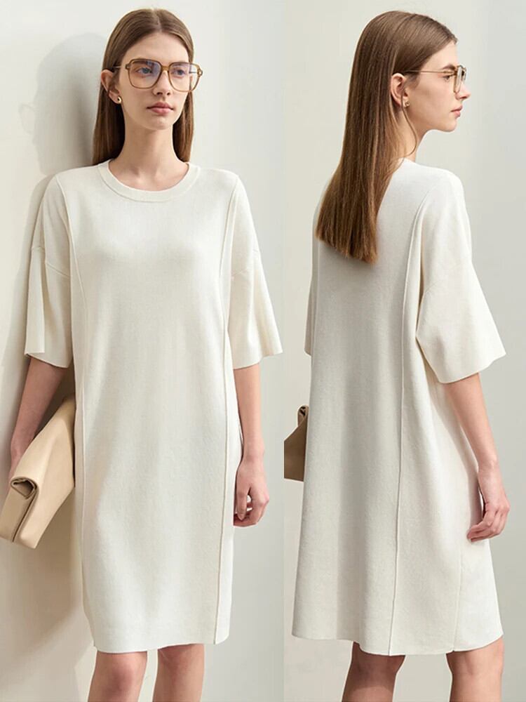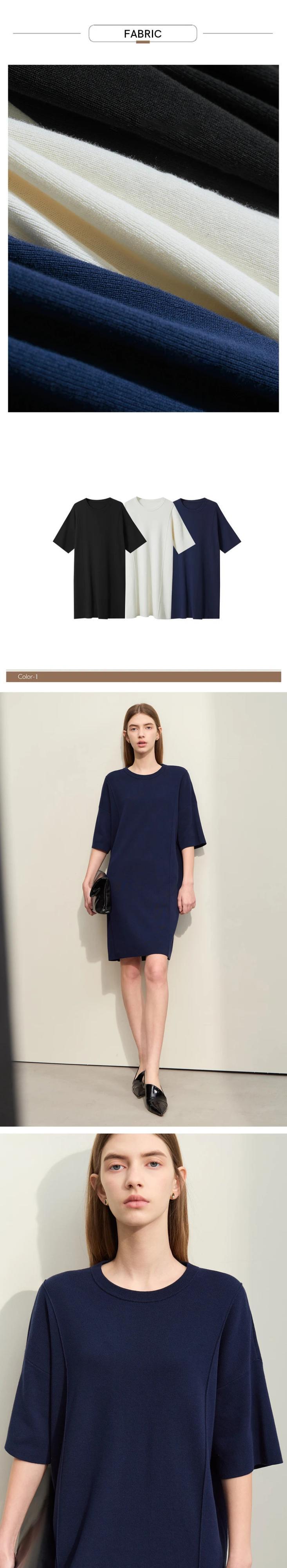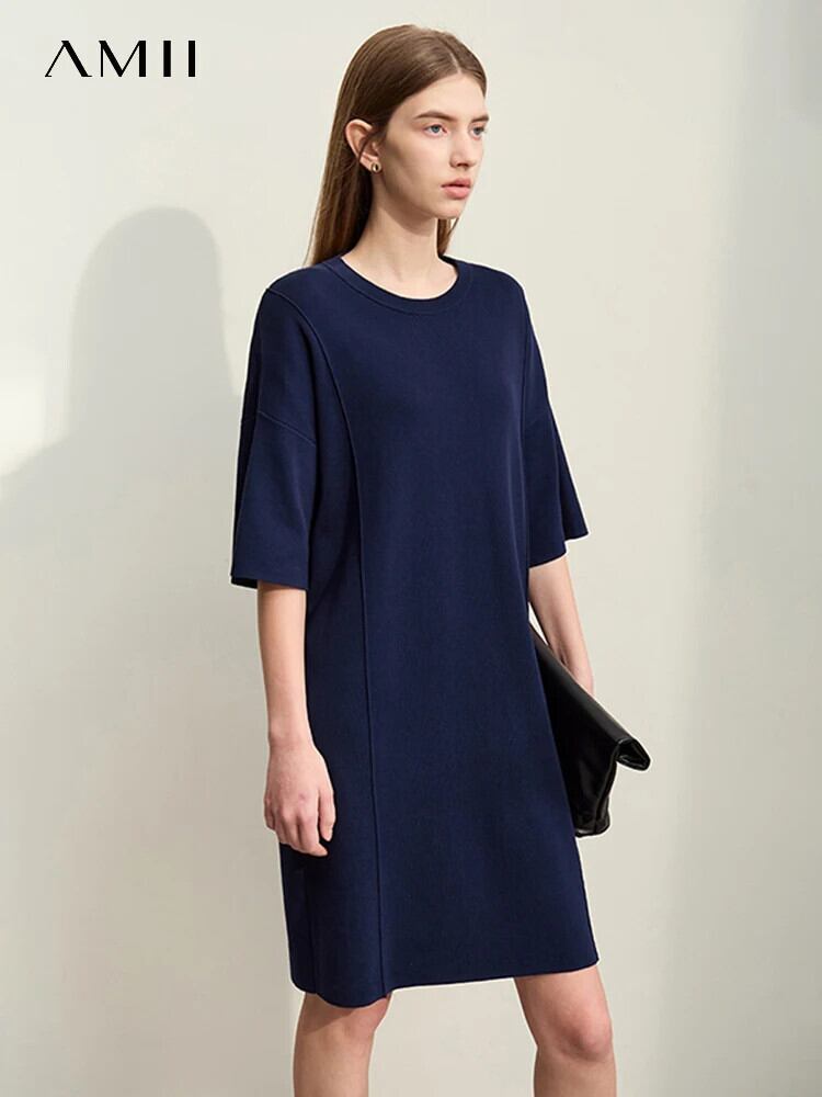 Amii ミニマリズム 2024 春ドレスソリッド O ネックプルオーバーミッドスリーブルーズオフィスレディニットドレス 12441282 スプリング 春物 Oネック ソリッドカラー 会社 学校 通勤や通学にも | twelve