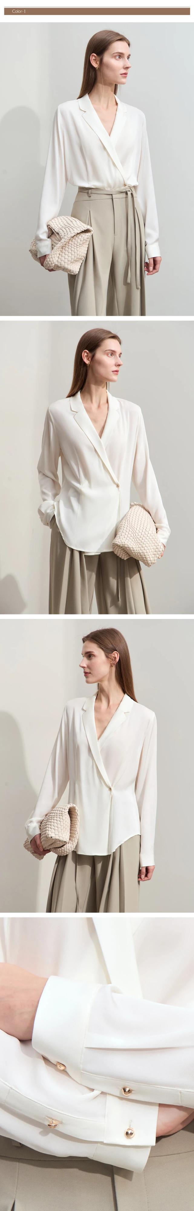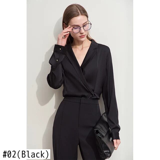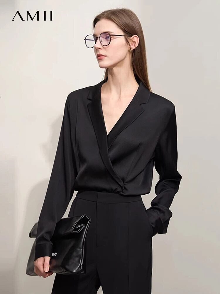 Amii ミニマリズム 2024 春ブラウスライト高級ソリッドラペル V ネックサイド前立て長袖ソフトトレンディ 12441293 ロング スプリング 春物 Vネック シルク ソリッドカラー | twelve