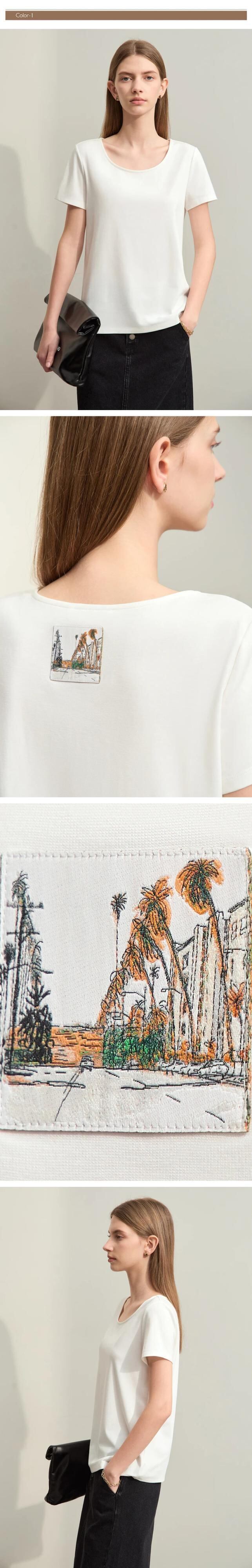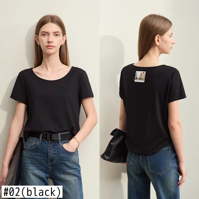 Amii ミニマリズム 2024 レディース Tシャツ 夏 無地 大きめ U ネック 半袖 プルオーバー スリム ストレッチ ラベル装飾 Tシャツ 12422072 サマー 夏物 ソリッドカラー | twelve