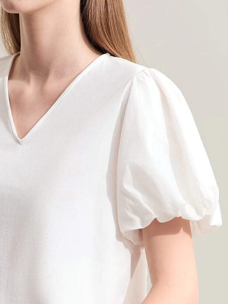 Amii ミニマリズム 2024 夏 Tシャツ V ネックスプライシングランタンスリーブ綿フレンチ O ネックトップス 12422052 コットン サマー 夏物 Oネック Vネック ソリッドカラー | twelve